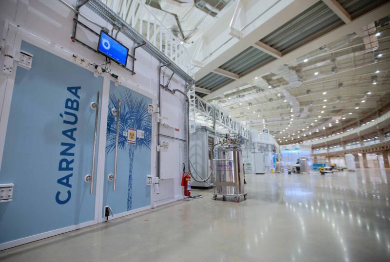 Parte da infraestrutura da linha de luz Carnaúba, no Sirius. A linha conta com duas estações experimentais, localizadas a 136 e 142 m da fonte de raios X, um ondulador de polarização vertical.
