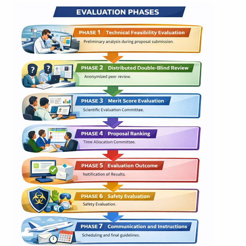 Phase 1 (Technical feasibility evaluation during the proposal submission period): Technical feasibility analysis will begin at the moment of proposal submission, without the need to wait for the final call deadline. Beamline scientists will provide feedback on technical feasibility issues as quickly as possible, allowing proponents to clarify aspects of the experiment and, when feasible, adjust the proposal to suit beamline capabilities. This process creates a more dynamic interaction, enabling refinement of proposals to make them technically viable.