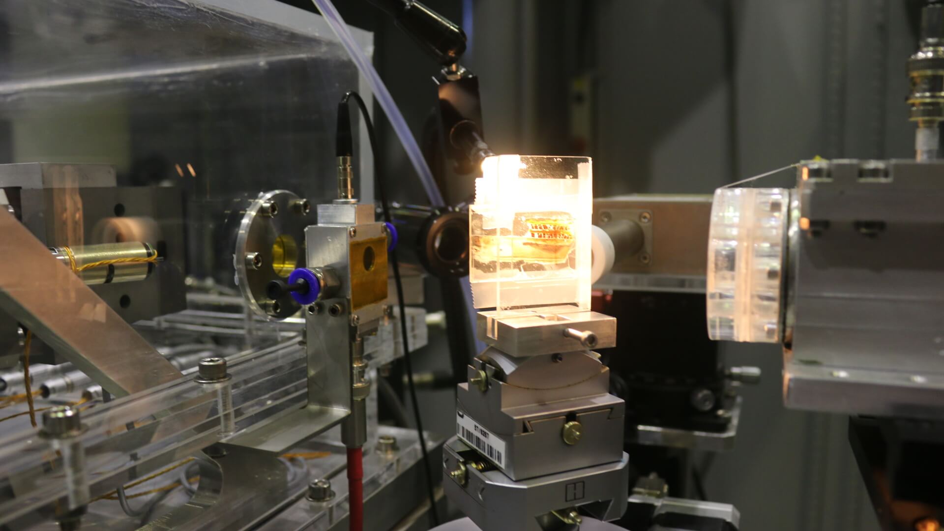 Português: Montagem de amostra no arranjo da microssonda de raios X.